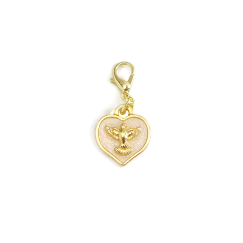 Pingente em formato de coração com o Divino Espiríto Santo centralizado, acabemento polido, pintado à mão com resina e fecho lagosta para customizar colares, pulseiras, chaveiros, etc.